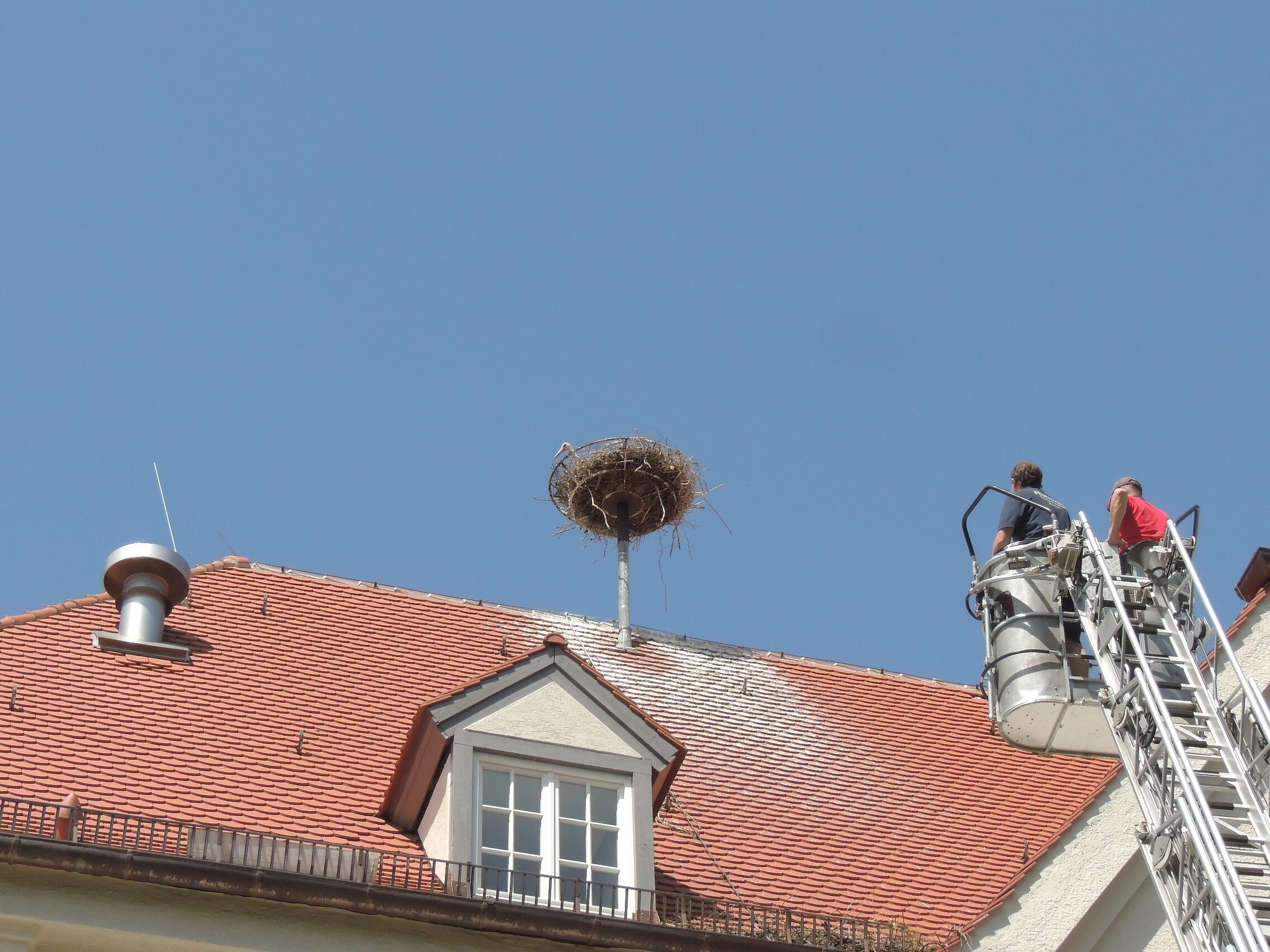 21.6. 2021. "Unser" Storch auf dem Horst des BN auf der alten Brennerei in Weihenstephan hat dieses Jahr ein properes Junges. Mit Hilfe der Weihenstephaner Werksfeuerwehr und den Technischen Diensten hat es Clemens Krafft in einer Minute beringt. Und drei Minuten später waren beide Altvögel wieder am Nest. Ein aufregender Tag für den jungen Storch.