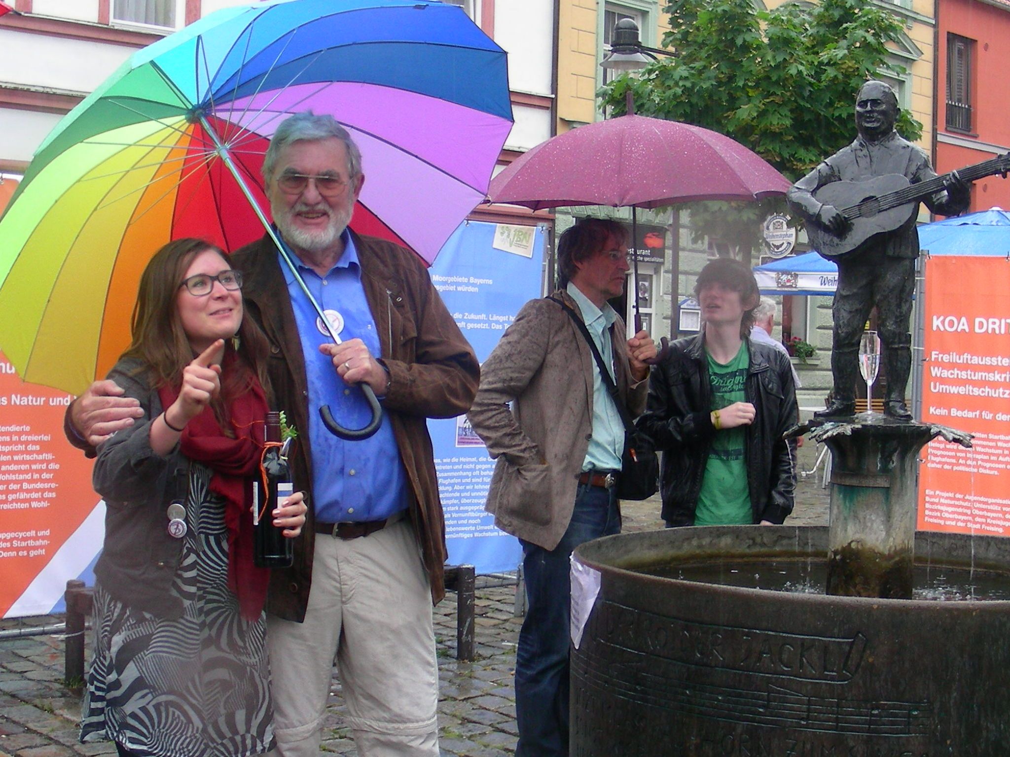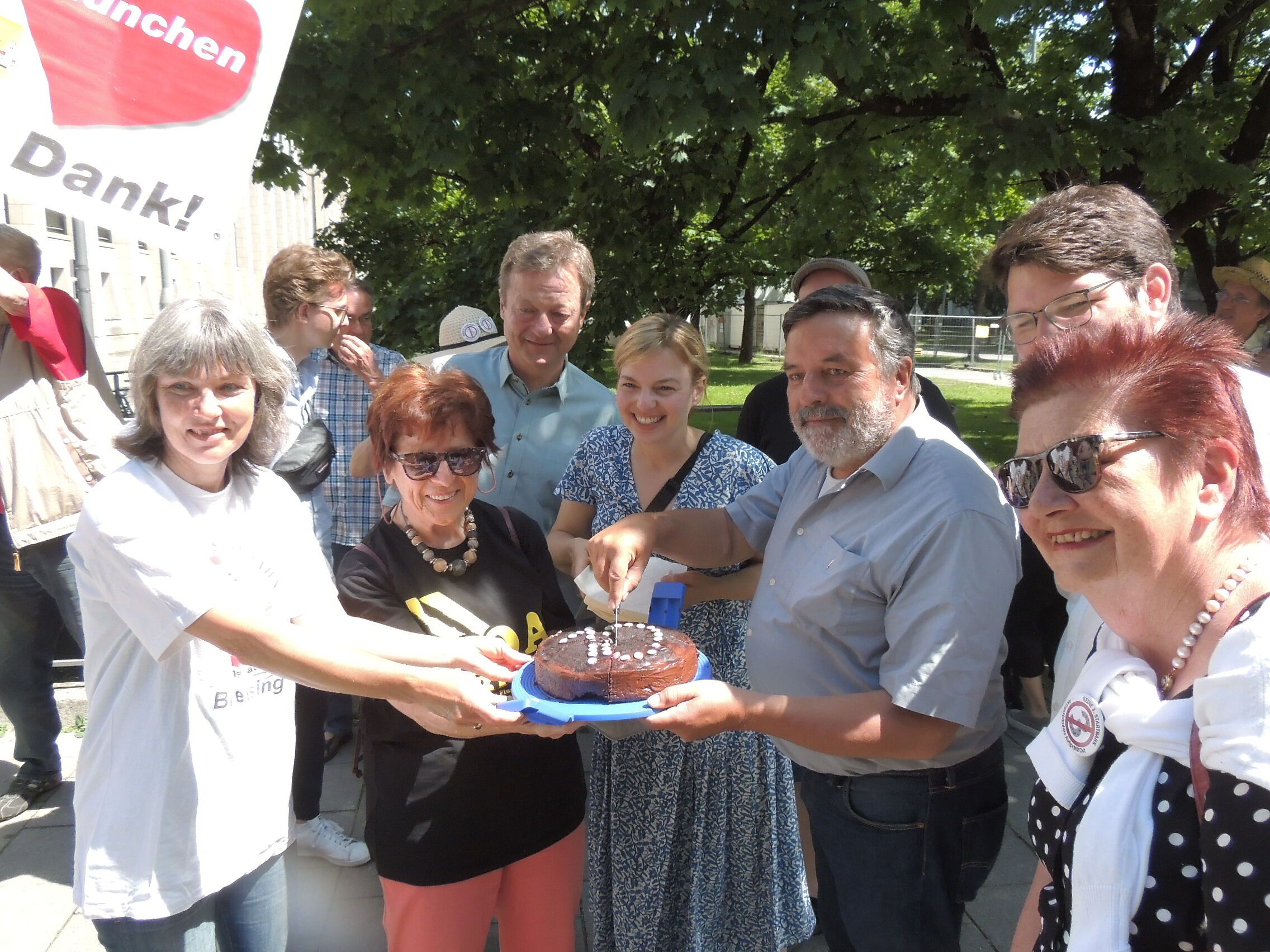 "Freising dankt München" - Unter diesem Motto feierte die Freisinger Bevölkerung rund um den Marienplatz den Erfolg beim Münchner Bürgerentscheid gegen die Dritte Startbahn. Mit dem Stadtfest wurde ein Versprechen eingelöst. Freising sagt Danke für die Solidarität der Münchner mit dem Umland und für ihre Stimmen gegen den klimaschädlichen Ausbau des Luftverkehrs. Die "Eisbären" der BN-Jugend zeichneten langjährige aktive Streiter für eine Zukunft OHNE 3. Bahn mit dem "kleinen Eisbären am Grünen Band" sowie Urkunden "für den besonderen Heldenmut angesichts des Klimawandels" aus. Zu den Preisträgern zählen u.a. Christine Margraf, Christian Magerl und Manfred Drobny (BN Freising), Helga Stieglmeier und Hartmut Binner (AufgeMUCkt), Doris Kräcker und Alfred Schreiber (VCD) sowie Oberbürgermeister Tobias Eschenbacher.