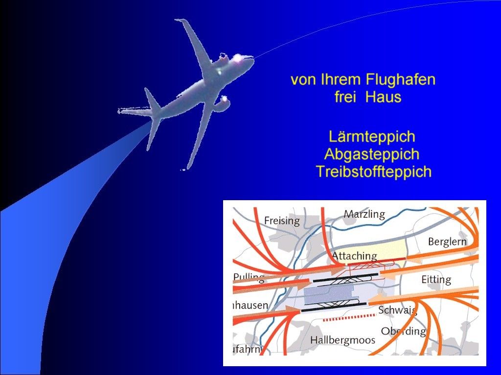 Luftverkehr geht alle an: Etwa 10 % des bayerischen CO-2-Verbrauchs geht auf das Konto des Flugverkehrs ab München. Und davon ein beträchtlicher Teil in der besonders klimaschädlichen Höhe. Das ist das Ergebnis einer von der FMG selbst unterstützten Studienarbeit an der TU München. Kein Wunder, dass die FMG zuerst allen daran beteiligten verboten hat, diese zu veröffentlichen. Erst auf Nachfragen hin wurde das Ergebnis bekannt. So macht das ungehemmte Fliegen jedwede Anstrengungen des Klimaschutzes zu Nichte. Das muss sich ändern - Wir kämpfen dafür.