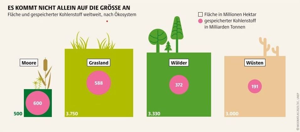 Torfböden besitzen die höchste Kohlenstoffspeicherung pro Fläche und speichern mehr als doppelt so viel Kohlenstoff wie alle Wälder der Erde zusammen.
